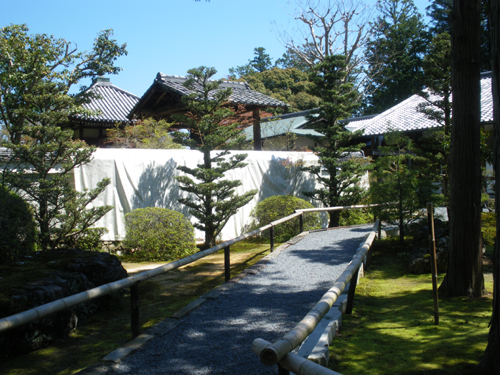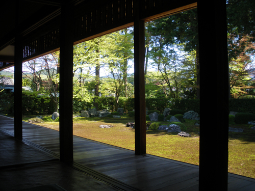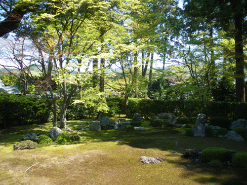 後水尾上皇の幡枝離宮のあとに、1678年(延宝6)、霊元天皇の乳母円光院文英尼公が妙心寺第10世の景川宗隆(けいせんそうりゅう)を勧請し創建。青苔におおわれた枯山水の平庭は、周囲にサザンカなど50種類の生垣をめぐらし、杉・ヒノキの木立を通し比叡山を望む借景式庭園で、名勝に指定されています。住所 | 京都市左京区岩倉幡枝町389 大きな地図で見る |
