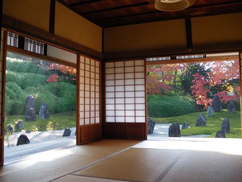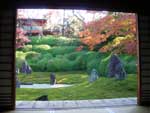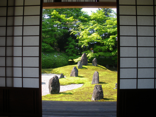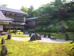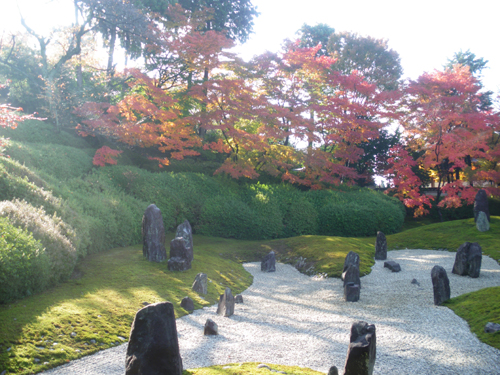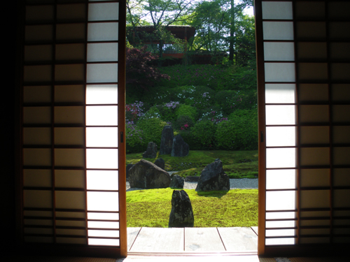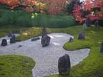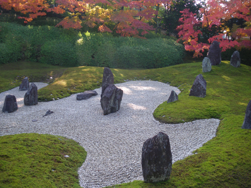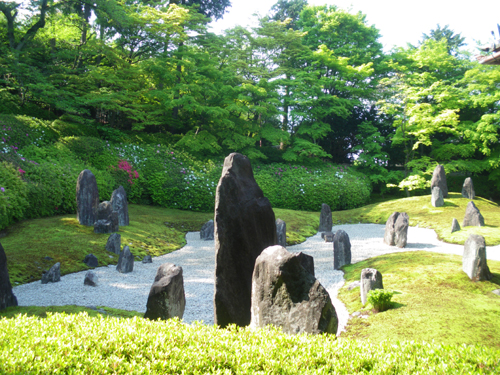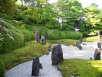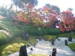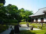 東福寺塔頭。1391年(明徳2)金山明昶の開創。方丈前の庭園は波心の庭です。池泉式の枯山水で、州浜型の枯池に三尊石組を配し、背後にサツキやツツジを雲紋になぞらえて刈り込み、雲の上に茶亭蘿月(らげつ)庵があり、月が昇る姿を形どっています。入り口には雲嶺の庭があります。住所 | 京都市東山区本町15丁目809 大きな地図で見る |